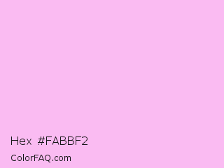 Hex #fabbf2 Color is a very light magenta color and the nearest color is Electric Lavender #f4bbff. Hex code #fabbf2 and RGB value is rgb(250,187,242). In RGB color space, this color is composed of 98% red, 73% green, 95% blue, In CMYK color space, this color is composed of 0% cyan, 25% magenta, 3% yellow , 2% black , In HSL color space, this color has a hue angle of 308° , 86% saturation and 86% lightness.