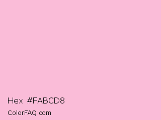 Hex #fabcd8 Color is a very light rose color and the nearest color is Cupid #fbbeda. Hex code #fabcd8 and RGB value is rgb(250,188,216). In RGB color space, this color is composed of 98% red, 74% green, 85% blue, In CMYK color space, this color is composed of 0% cyan, 25% magenta, 14% yellow , 2% black , In HSL color space, this color has a hue angle of 333° , 86% saturation and 86% lightness.