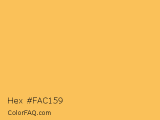 Hex #fac159 Color is a light orange color and the nearest color is Saffron Mango #f9bf58. Hex code #fac159 and RGB value is rgb(250,193,89). In RGB color space, this color is composed of 98% red, 76% green, 35% blue, In CMYK color space, this color is composed of 0% cyan, 23% magenta, 64% yellow , 2% black , In HSL color space, this color has a hue angle of 39° , 94% saturation and 66% lightness.