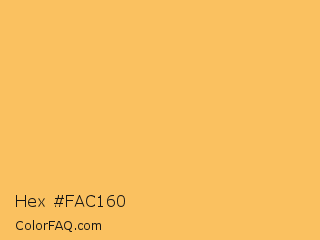 Hex #fac160 Color is a light orange color and the nearest color is Koromiko #ffbd5f. Hex code #fac160 and RGB value is rgb(250,193,96). In RGB color space, this color is composed of 98% red, 76% green, 38% blue, In CMYK color space, this color is composed of 0% cyan, 23% magenta, 62% yellow , 2% black , In HSL color space, this color has a hue angle of 38° , 94% saturation and 68% lightness.