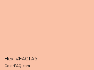 Hex #fac1a6 Color is a very light orange color and the nearest color is Wax Flower #ffc0a8. Hex code #fac1a6 and RGB value is rgb(250,193,166). In RGB color space, this color is composed of 98% red, 76% green, 65% blue, In CMYK color space, this color is composed of 0% cyan, 23% magenta, 34% yellow , 2% black , In HSL color space, this color has a hue angle of 19° , 89% saturation and 82% lightness.