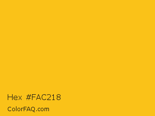 Hex #fac218 Color is a normal orange color and the nearest color is Lightning Yellow #fcc01e. Hex code #fac218 and RGB value is rgb(250,194,24). In RGB color space, this color is composed of 98% red, 76% green, 9% blue, In CMYK color space, this color is composed of 0% cyan, 22% magenta, 90% yellow , 2% black , In HSL color space, this color has a hue angle of 45° , 96% saturation and 54% lightness.