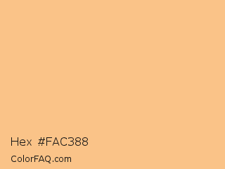 Hex #fac388 Color is a light orange color and the nearest color is Macaroni And Cheese #ffbd88. Hex code #fac388 and RGB value is rgb(250,195,136). In RGB color space, this color is composed of 98% red, 76% green, 53% blue, In CMYK color space, this color is composed of 0% cyan, 22% magenta, 46% yellow , 2% black , In HSL color space, this color has a hue angle of 31° , 92% saturation and 76% lightness.