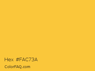 Hex #fac73a Color is a normal orange color and the nearest color is Sunglow #ffcc33. Hex code #fac73a and RGB value is rgb(250,199,58). In RGB color space, this color is composed of 98% red, 78% green, 23% blue, In CMYK color space, this color is composed of 0% cyan, 20% magenta, 77% yellow , 2% black , In HSL color space, this color has a hue angle of 44° , 95% saturation and 60% lightness.