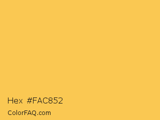 Hex #fac852 Color is a light orange color and the nearest color is Saffron Mango #f9bf58. Hex code #fac852 and RGB value is rgb(250,200,82). In RGB color space, this color is composed of 98% red, 78% green, 32% blue, In CMYK color space, this color is composed of 0% cyan, 20% magenta, 67% yellow , 2% black , In HSL color space, this color has a hue angle of 42° , 94% saturation and 65% lightness.