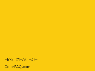 Hex #facb0e Color is a normal yellow color and the nearest color is Mikado Yellow #ffc40c. Hex code #facb0e and RGB value is rgb(250,203,14). In RGB color space, this color is composed of 98% red, 80% green, 5% blue, In CMYK color space, this color is composed of 0% cyan, 19% magenta, 94% yellow , 2% black , In HSL color space, this color has a hue angle of 48° , 96% saturation and 52% lightness.