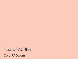 Hex #facbbb Color is a very light color and the nearest color is Romantic #ffd2b7. Hex code #facbbb and RGB value is rgb(250,203,187). In RGB color space, this color is composed of 98% red, 80% green, 73% blue, In CMYK color space, this color is composed of 0% cyan, 19% magenta, 25% yellow , 2% black , In HSL color space, this color has a hue angle of 15° , 86% saturation and 86% lightness.