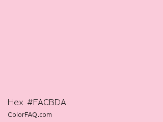 Hex #facbda Color is a very light rose color and the nearest color is Azalea #f7c8da. Hex code #facbda and RGB value is rgb(250,203,218). In RGB color space, this color is composed of 98% red, 80% green, 85% blue, In CMYK color space, this color is composed of 0% cyan, 19% magenta, 13% yellow , 2% black , In HSL color space, this color has a hue angle of 341° , 82% saturation and 89% lightness.