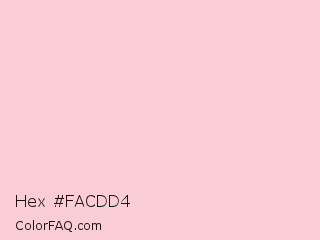 Hex #facdd4 Color is a very light red color and the nearest color is Azalea #f7c8da. Hex code #facdd4 and RGB value is rgb(250,205,212). In RGB color space, this color is composed of 98% red, 80% green, 83% blue, In CMYK color space, this color is composed of 0% cyan, 18% magenta, 15% yellow , 2% black , In HSL color space, this color has a hue angle of 351° , 82% saturation and 89% lightness.
