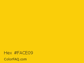 Hex #face09 Color is a normal yellow color and the nearest color is Tangerine Yellow #ffcc00. Hex code #face09 and RGB value is rgb(250,206,9). In RGB color space, this color is composed of 98% red, 81% green, 4% blue, In CMYK color space, this color is composed of 0% cyan, 18% magenta, 96% yellow , 2% black , In HSL color space, this color has a hue angle of 49° , 96% saturation and 51% lightness.