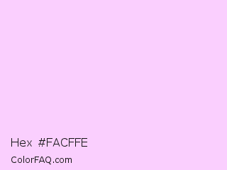 Hex #facffe Color is a very light magenta color and the nearest color is Shampoo #ffcff1. Hex code #facffe and RGB value is rgb(250,207,254). In RGB color space, this color is composed of 98% red, 81% green, 100% blue, In CMYK color space, this color is composed of 2% cyan, 19% magenta, 0% yellow , 0% black , In HSL color space, this color has a hue angle of 295° , 96% saturation and 90% lightness.