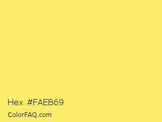 Hex #faeb69 Color is a light yellow color and the nearest color is Festival #fbe96c. Hex code #faeb69 and RGB value is rgb(250,235,105). In RGB color space, this color is composed of 98% red, 92% green, 41% blue, In CMYK color space, this color is composed of 0% cyan, 6% magenta, 58% yellow , 2% black , In HSL color space, this color has a hue angle of 54° , 94% saturation and 70% lightness.