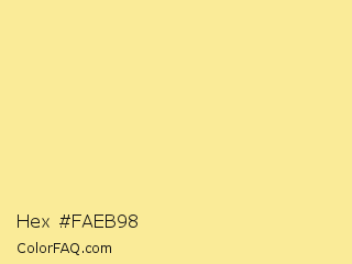 Hex #faeb98 Color is a light yellow color and the nearest color is Golden Glow #fde295. Hex code #faeb98 and RGB value is rgb(250,235,152). In RGB color space, this color is composed of 98% red, 92% green, 60% blue, In CMYK color space, this color is composed of 0% cyan, 6% magenta, 39% yellow , 2% black , In HSL color space, this color has a hue angle of 51° , 91% saturation and 79% lightness.