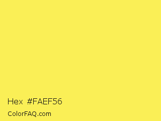 Hex #faef56 Color is a light yellow color and the nearest color is Candy Corn #fbec5d. Hex code #faef56 and RGB value is rgb(250,239,86). In RGB color space, this color is composed of 98% red, 94% green, 34% blue, In CMYK color space, this color is composed of 0% cyan, 4% magenta, 66% yellow , 2% black , In HSL color space, this color has a hue angle of 56° , 94% saturation and 66% lightness.