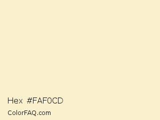 Hex #faf0cd Color is a very light yellow color and the nearest color is Light Champagne #faeccc. Hex code #faf0cd and RGB value is rgb(250,240,205). In RGB color space, this color is composed of 98% red, 94% green, 80% blue, In CMYK color space, this color is composed of 0% cyan, 4% magenta, 18% yellow , 2% black , In HSL color space, this color has a hue angle of 47° , 82% saturation and 89% lightness.