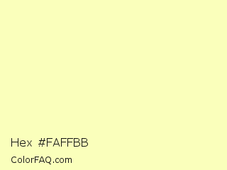 Hex #faffbb Color is a very light yellow color and the nearest color is Shalimar #fbffba. Hex code #faffbb and RGB value is rgb(250,255,187). In RGB color space, this color is composed of 98% red, 100% green, 73% blue, In CMYK color space, this color is composed of 2% cyan, 0% magenta, 27% yellow , 0% black , In HSL color space, this color has a hue angle of 64° , 100% saturation and 87% lightness.