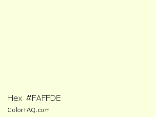 Hex #faffde Color is a very light yellow color and the nearest color is Spring Sun #f6ffdc. Hex code #faffde and RGB value is rgb(250,255,222). In RGB color space, this color is composed of 98% red, 100% green, 87% blue, In CMYK color space, this color is composed of 2% cyan, 0% magenta, 13% yellow , 0% black , In HSL color space, this color has a hue angle of 69° , 100% saturation and 94% lightness.