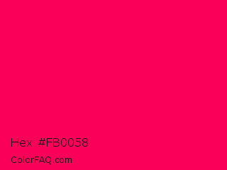 Hex #fb0058 Color is a normal rose color and the nearest color is Folly #ff004f. Hex code #fb0058 and RGB value is rgb(251,0,88). In RGB color space, this color is composed of 98% red, 0% green, 35% blue, In CMYK color space, this color is composed of 0% cyan, 100% magenta, 65% yellow , 2% black , In HSL color space, this color has a hue angle of 339° , 100% saturation and 49% lightness.