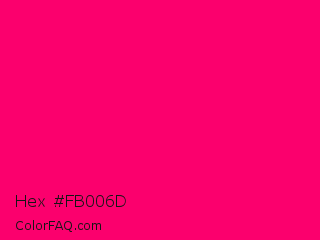 Hex #fb006d Color is a normal rose color and the nearest color is Vivid Raspberry #ff006c. Hex code #fb006d and RGB value is rgb(251,0,109). In RGB color space, this color is composed of 98% red, 0% green, 43% blue, In CMYK color space, this color is composed of 0% cyan, 100% magenta, 57% yellow , 2% black , In HSL color space, this color has a hue angle of 334° , 100% saturation and 49% lightness.