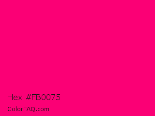 Hex #fb0075 Color is a normal rose color and the nearest color is Winter Sky #ff007c. Hex code #fb0075 and RGB value is rgb(251,0,117). In RGB color space, this color is composed of 98% red, 0% green, 46% blue, In CMYK color space, this color is composed of 0% cyan, 100% magenta, 53% yellow , 2% black , In HSL color space, this color has a hue angle of 332° , 100% saturation and 49% lightness.