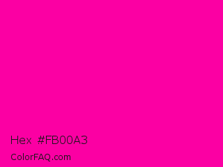 Hex #fb00a3 Color is a normal magenta color and the nearest color is Hollywood Cerise #f400a1. Hex code #fb00a3 and RGB value is rgb(251,0,163). In RGB color space, this color is composed of 98% red, 0% green, 64% blue, In CMYK color space, this color is composed of 0% cyan, 100% magenta, 35% yellow , 2% black , In HSL color space, this color has a hue angle of 321° , 100% saturation and 49% lightness.