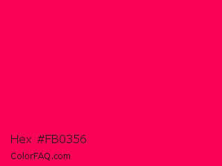 Hex #fb0356 Color is a normal rose color and the nearest color is Folly #ff004f. Hex code #fb0356 and RGB value is rgb(251,3,86). In RGB color space, this color is composed of 98% red, 1% green, 34% blue, In CMYK color space, this color is composed of 0% cyan, 99% magenta, 66% yellow , 2% black , In HSL color space, this color has a hue angle of 340° , 98% saturation and 50% lightness.