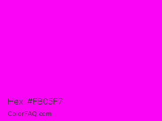 Hex #fb05f7 Color is a normal magenta color and the nearest color is Magenta / Fuchsia #ff00ff. Hex code #fb05f7 and RGB value is rgb(251,5,247). In RGB color space, this color is composed of 98% red, 2% green, 97% blue, In CMYK color space, this color is composed of 0% cyan, 98% magenta, 2% yellow , 2% black , In HSL color space, this color has a hue angle of 301° , 97% saturation and 50% lightness.