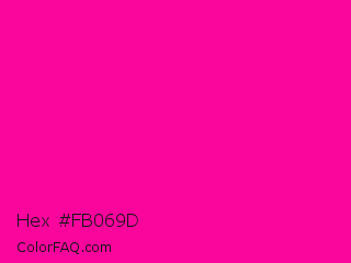 Hex #fb069d Color is a normal magenta color and the nearest color is Hollywood Cerise #f400a1. Hex code #fb069d and RGB value is rgb(251,6,157). In RGB color space, this color is composed of 98% red, 2% green, 62% blue, In CMYK color space, this color is composed of 0% cyan, 98% magenta, 37% yellow , 2% black , In HSL color space, this color has a hue angle of 323° , 97% saturation and 50% lightness.