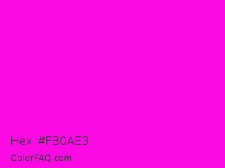 Hex #fb0ae3 Color is a normal magenta color and the nearest color is Purple Pizzazz #ff00cc. Hex code #fb0ae3 and RGB value is rgb(251,10,227). In RGB color space, this color is composed of 98% red, 4% green, 89% blue, In CMYK color space, this color is composed of 0% cyan, 96% magenta, 10% yellow , 2% black , In HSL color space, this color has a hue angle of 306° , 97% saturation and 51% lightness.