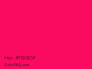 Hex #fb0b5f Color is a normal rose color and the nearest color is Vivid Raspberry #ff006c. Hex code #fb0b5f and RGB value is rgb(251,11,95). In RGB color space, this color is composed of 98% red, 4% green, 37% blue, In CMYK color space, this color is composed of 0% cyan, 96% magenta, 62% yellow , 2% black , In HSL color space, this color has a hue angle of 339° , 97% saturation and 51% lightness.