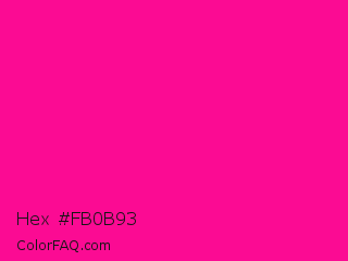 Hex #fb0b93 Color is a normal magenta color and the nearest color is Fluorescent Pink #ff1493. Hex code #fb0b93 and RGB value is rgb(251,11,147). In RGB color space, this color is composed of 98% red, 4% green, 58% blue, In CMYK color space, this color is composed of 0% cyan, 96% magenta, 41% yellow , 2% black , In HSL color space, this color has a hue angle of 326° , 97% saturation and 51% lightness.