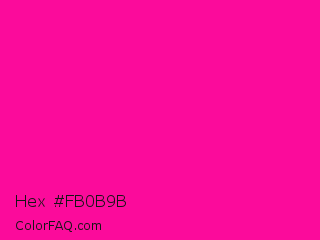 Hex #fb0b9b Color is a normal magenta color and the nearest color is Fluorescent Pink #ff1493. Hex code #fb0b9b and RGB value is rgb(251,11,155). In RGB color space, this color is composed of 98% red, 4% green, 61% blue, In CMYK color space, this color is composed of 0% cyan, 96% magenta, 38% yellow , 2% black , In HSL color space, this color has a hue angle of 324° , 97% saturation and 51% lightness.