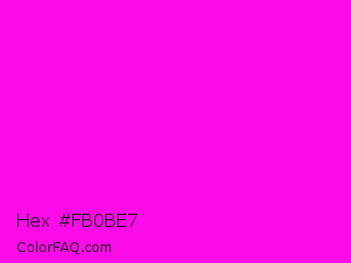 Hex #fb0be7 Color is a normal magenta color and the nearest color is Magenta / Fuchsia #ff00ff. Hex code #fb0be7 and RGB value is rgb(251,11,231). In RGB color space, this color is composed of 98% red, 4% green, 91% blue, In CMYK color space, this color is composed of 0% cyan, 96% magenta, 8% yellow , 2% black , In HSL color space, this color has a hue angle of 305° , 97% saturation and 51% lightness.