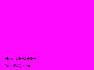 Hex #fb0bff Color is a normal magenta color and the nearest color is Magenta / Fuchsia #ff00ff. Hex code #fb0bff and RGB value is rgb(251,11,255). In RGB color space, this color is composed of 98% red, 4% green, 100% blue, In CMYK color space, this color is composed of 2% cyan, 96% magenta, 0% yellow , 0% black , In HSL color space, this color has a hue angle of 299° , 100% saturation and 52% lightness.