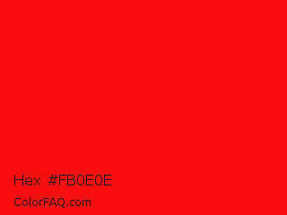 Hex #fb0e0e Color is a normal red color and the nearest color is Vivid Red #f70d1a. Hex code #fb0e0e and RGB value is rgb(251,14,14). In RGB color space, this color is composed of 98% red, 5% green, 5% blue, In CMYK color space, this color is composed of 0% cyan, 94% magenta, 94% yellow , 2% black , In HSL color space, this color has a hue angle of 0° , 97% saturation and 52% lightness.