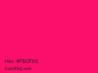 Hex #fb0f66 Color is a normal rose color and the nearest color is Vivid Raspberry #ff006c. Hex code #fb0f66 and RGB value is rgb(251,15,102). In RGB color space, this color is composed of 98% red, 6% green, 40% blue, In CMYK color space, this color is composed of 0% cyan, 94% magenta, 59% yellow , 2% black , In HSL color space, this color has a hue angle of 338° , 97% saturation and 52% lightness.