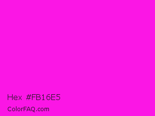 Hex #fb16e5 Color is a normal magenta color and the nearest color is Hot Magenta #ff1dce. Hex code #fb16e5 and RGB value is rgb(251,22,229). In RGB color space, this color is composed of 98% red, 9% green, 90% blue, In CMYK color space, this color is composed of 0% cyan, 91% magenta, 9% yellow , 2% black , In HSL color space, this color has a hue angle of 306° , 97% saturation and 54% lightness.
