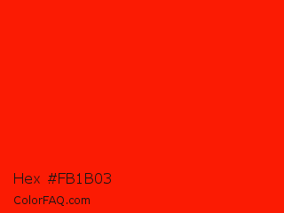 Hex #fb1b03 Color is a normal red color and the nearest color is Scarlet #ff2400. Hex code #fb1b03 and RGB value is rgb(251,27,3). In RGB color space, this color is composed of 98% red, 11% green, 1% blue, In CMYK color space, this color is composed of 0% cyan, 89% magenta, 99% yellow , 2% black , In HSL color space, this color has a hue angle of 6° , 98% saturation and 50% lightness.