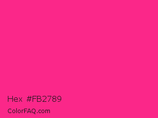 Hex #fb2789 Color is a normal rose color and the nearest color is Wild Strawberry Crayola #ff3399. Hex code #fb2789 and RGB value is rgb(251,39,137). In RGB color space, this color is composed of 98% red, 15% green, 54% blue, In CMYK color space, this color is composed of 0% cyan, 84% magenta, 45% yellow , 2% black , In HSL color space, this color has a hue angle of 332° , 96% saturation and 57% lightness.