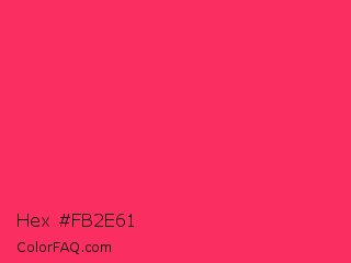Hex #fb2e61 Color is a normal red color and the nearest color is Radical Red #ff355e. Hex code #fb2e61 and RGB value is rgb(251,46,97). In RGB color space, this color is composed of 98% red, 18% green, 38% blue, In CMYK color space, this color is composed of 0% cyan, 82% magenta, 61% yellow , 2% black , In HSL color space, this color has a hue angle of 345° , 96% saturation and 58% lightness.