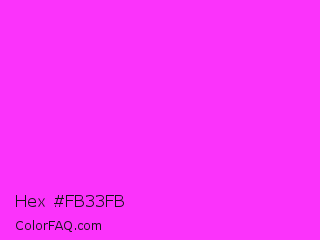 Hex #fb33fb Color is a normal magenta color and the nearest color is Purple Pizzazz #fe4eda. Hex code #fb33fb and RGB value is rgb(251,51,251). In RGB color space, this color is composed of 98% red, 20% green, 98% blue, In CMYK color space, this color is composed of 0% cyan, 80% magenta, 0% yellow , 2% black , In HSL color space, this color has a hue angle of 300° , 96% saturation and 59% lightness.