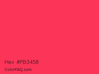 Hex #fb3458 Color is a normal red color and the nearest color is Sizzling Red #ff3855. Hex code #fb3458 and RGB value is rgb(251,52,88). In RGB color space, this color is composed of 98% red, 20% green, 35% blue, In CMYK color space, this color is composed of 0% cyan, 79% magenta, 65% yellow , 2% black , In HSL color space, this color has a hue angle of 349° , 96% saturation and 59% lightness.