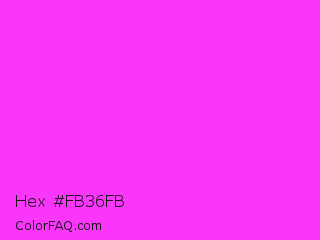 Hex #fb36fb Color is a normal magenta color and the nearest color is Purple Pizzazz #fe4eda. Hex code #fb36fb and RGB value is rgb(251,54,251). In RGB color space, this color is composed of 98% red, 21% green, 98% blue, In CMYK color space, this color is composed of 0% cyan, 78% magenta, 0% yellow , 2% black , In HSL color space, this color has a hue angle of 300° , 96% saturation and 60% lightness.