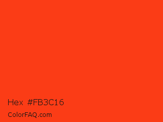 Hex #fb3c16 Color is a normal red color and the nearest color is Pomegranate #f34723. Hex code #fb3c16 and RGB value is rgb(251,60,22). In RGB color space, this color is composed of 98% red, 24% green, 9% blue, In CMYK color space, this color is composed of 0% cyan, 76% magenta, 91% yellow , 2% black , In HSL color space, this color has a hue angle of 10° , 97% saturation and 54% lightness.