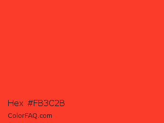 Hex #fb3c2b Color is a normal red color and the nearest color is Red Orange #ff3f34. Hex code #fb3c2b and RGB value is rgb(251,60,43). In RGB color space, this color is composed of 98% red, 24% green, 17% blue, In CMYK color space, this color is composed of 0% cyan, 76% magenta, 83% yellow , 2% black , In HSL color space, this color has a hue angle of 5° , 96% saturation and 58% lightness.