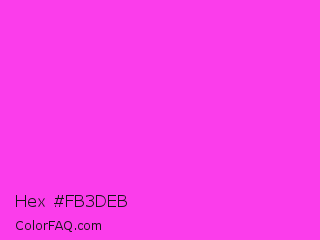 Hex #fb3deb Color is a light magenta color and the nearest color is Purple Pizzazz #fe4eda. Hex code #fb3deb and RGB value is rgb(251,61,235). In RGB color space, this color is composed of 98% red, 24% green, 92% blue, In CMYK color space, this color is composed of 0% cyan, 76% magenta, 6% yellow , 2% black , In HSL color space, this color has a hue angle of 305° , 96% saturation and 61% lightness.