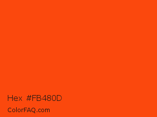 Hex #fb480d Color is a normal color and the nearest color is Orioles Orange #fb4f14. Hex code #fb480d and RGB value is rgb(251,72,13). In RGB color space, this color is composed of 98% red, 28% green, 5% blue, In CMYK color space, this color is composed of 0% cyan, 71% magenta, 95% yellow , 2% black , In HSL color space, this color has a hue angle of 15° , 97% saturation and 52% lightness.