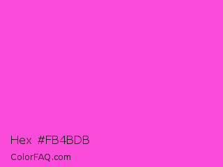 Hex #fb4bdb Color is a light magenta color and the nearest color is Purple Pizzazz #fe4eda. Hex code #fb4bdb and RGB value is rgb(251,75,219). In RGB color space, this color is composed of 98% red, 29% green, 86% blue, In CMYK color space, this color is composed of 0% cyan, 70% magenta, 13% yellow , 2% black , In HSL color space, this color has a hue angle of 311° , 96% saturation and 64% lightness.