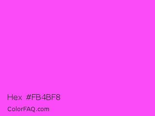 Hex #fb4bf8 Color is a light magenta color and the nearest color is Pink Flamingo Crayola #ff66ff. Hex code #fb4bf8 and RGB value is rgb(251,75,248). In RGB color space, this color is composed of 98% red, 29% green, 97% blue, In CMYK color space, this color is composed of 0% cyan, 70% magenta, 1% yellow , 2% black , In HSL color space, this color has a hue angle of 301° , 96% saturation and 64% lightness.