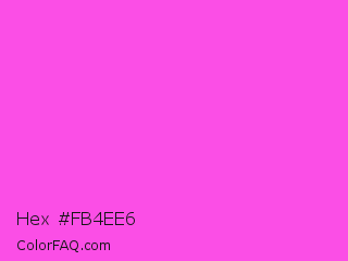 Hex #fb4ee6 Color is a light magenta color and the nearest color is Purple Pizzazz #fe4eda. Hex code #fb4ee6 and RGB value is rgb(251,78,230). In RGB color space, this color is composed of 98% red, 31% green, 90% blue, In CMYK color space, this color is composed of 0% cyan, 69% magenta, 8% yellow , 2% black , In HSL color space, this color has a hue angle of 307° , 96% saturation and 65% lightness.